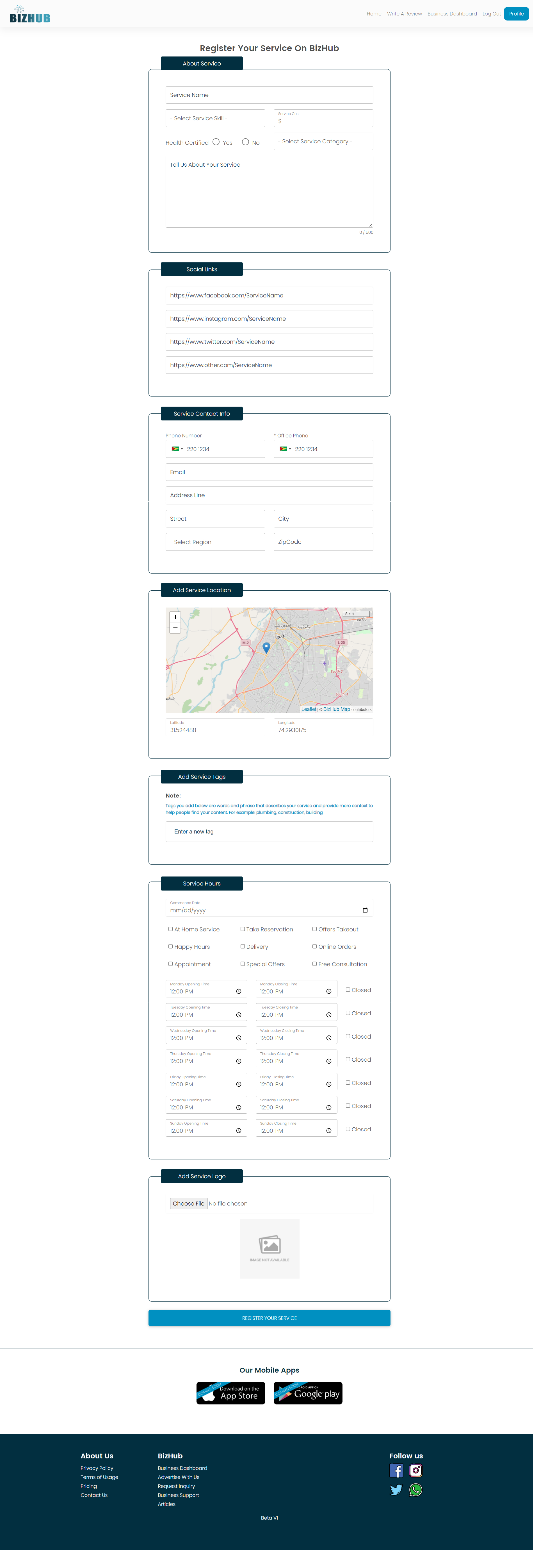 Enter Details Like (Service Name, service skill level, service cost, service category, social Links, Service Contact information, Service Location, Service Hours, service Logo )