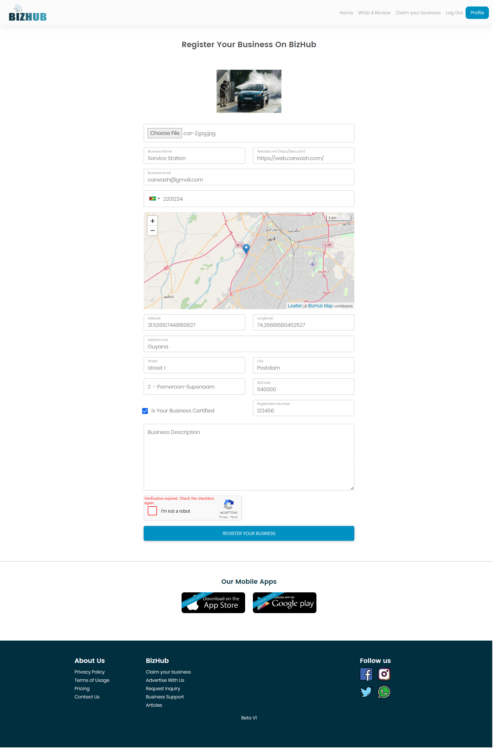 Enter Details (Business Logo, Business Name, Business website Link, Business Email, Contact Info, Business Location, Business complete address, Business certification number)